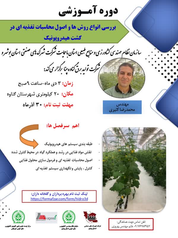 سازمان نظام مهندسی کشاورزی و منابع طبیعی با حمایت شرکت شهرک های صنعتی استان بوشهر و شرکت تولیدی برق گناوه مپنا برگزار می کند:
