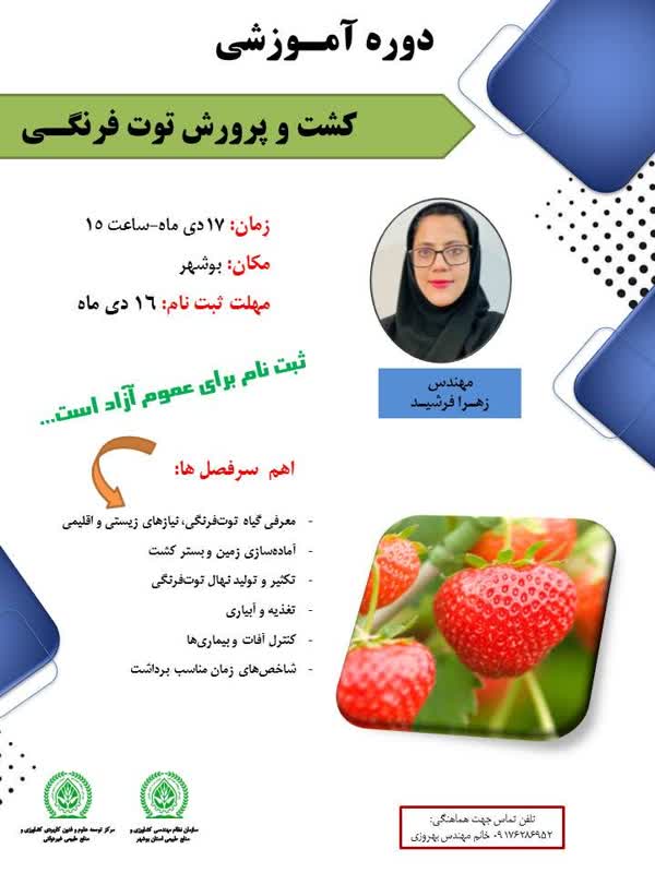 سازمان نظام مهندسی کشاورزی و منابع طبیعی با همکاری مرکز توسعه علوم و فنون کاربردی کشاورزی و منابع طبیعی غیردولتی خانم زهرا بهروزی دوره آموزشی کشت و پرورش توت فرنگی را برگزار می کند