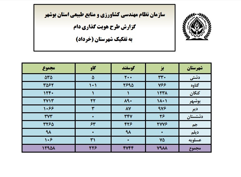 مطابق گزارش حاصله از سامانه جامع هویت گذاری دام استان،گزارش هویت گذاری خرداد ماهنامه 1400 اعلام شد