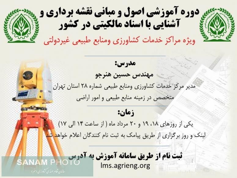 دوره آموزشی کاربردی اصول و مبانی نقشه برداری و آشنایی با اسناد مالکیتی در کشور به همت دفتر مجری امور شاغلین حرفه ای و معاونت آموزشی و فنی سازمان نظام مهندسی کشاورزی و منابع طبیعی کشور ویژه مراکز خدمات کشاورزی و منابع طبیعی غیردولتی با اعطای گواهینامه آموزشی معتبر برگزار می گردد.