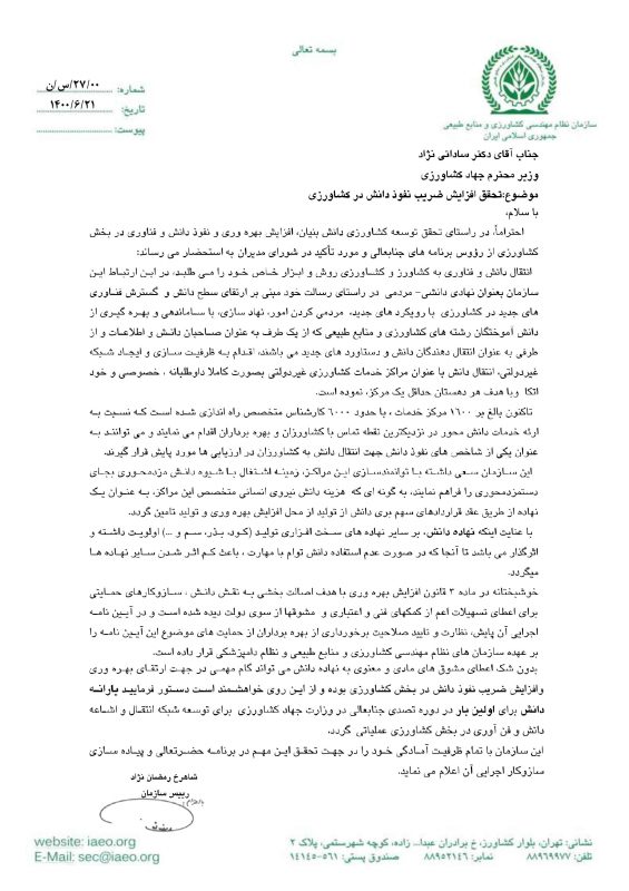 شایان ذکر است در این نامه رییس سازمان مرکزی، اختصاص یارانه دانش برای اولین بار در دوره تصدی وزارت جهادکشاورزی برای توسعه شبکه انتقال و اشاعه دانش و فناوری در بخش کشاورزی را از وزیر جهادکشاورزی خواستار شده است.
