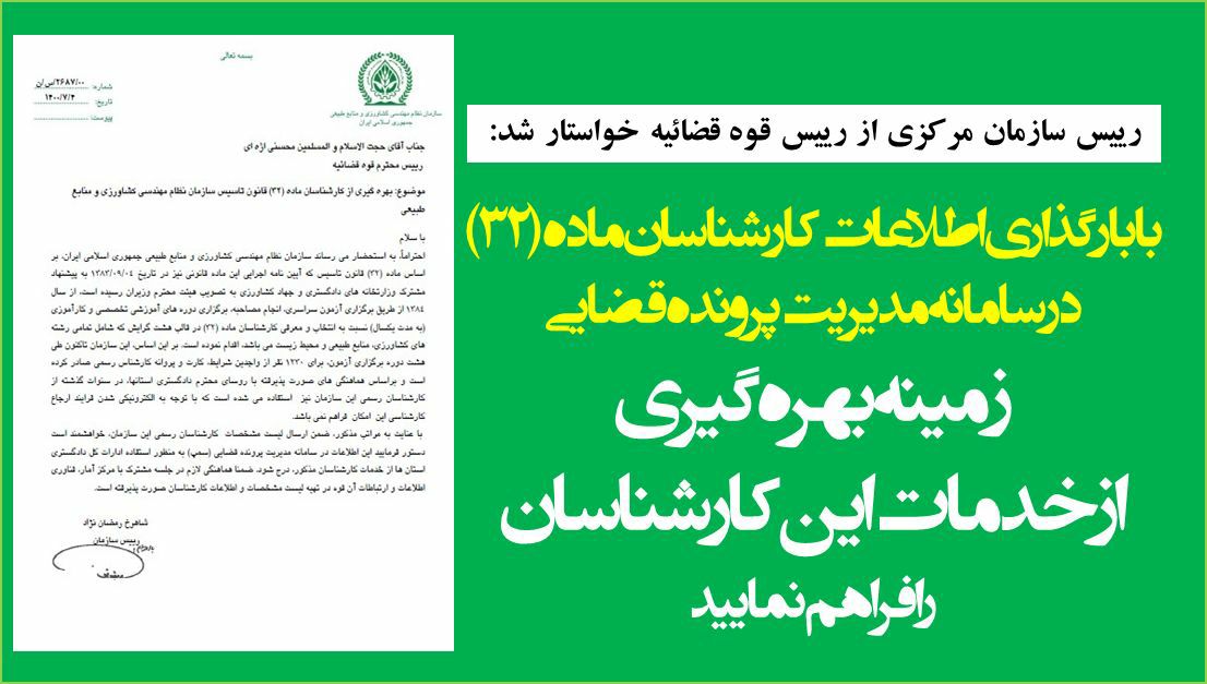 🔸به گزارش پایگاه اطلاع رسانی سنم، شاهرخ رمضان نژاد در نامه خود به حجت الاسلام والمسلمین محسنی اژه ای، با اشاره به فرآیند انتخاب و معرفی این کارشناسان توسط سازمان نظام مهندسی آورده است؛ سازمان نظام مهندسی کشاورزی و منابع طبیعی جمهوری اسلامی ایران، بر اساس ماده (۳۲) قانون تاسیس و آیین نامه اجرایی این ماده قانونی (مصوب هیئت وزیران)، از سال ۱۳۸۴ از طریق برگزاری آزمون سراسری، انجام مصاحبه، برگزاری دوره های آموزشی تخصصی و کارآموزی نسبت به انتخاب و معرفی کارشناسان ماده (۳۲) در قالب هشت گرایش که شامل تمامی رشته های کشاورزی، منابع طبیعی محیط زیست می باشد، اقدام نموده است.