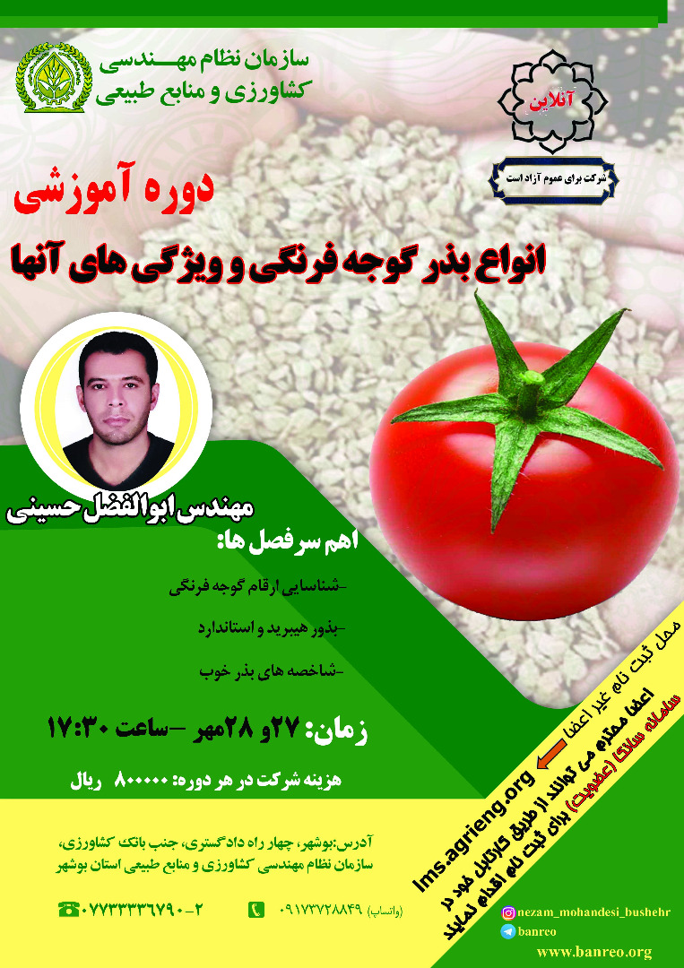 دوره آموزشی آشنایی با انواع بذر گوجه فرنگی و ویژگی های آن برگزار می گردد ؛ از علاقه مندان اموزش در این حوزه دعوت می گردد جهت ثبت نام به ادرس های زیر مراجعه کنند.