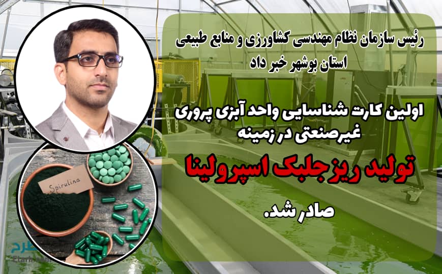 ▶️به گزارش روابط عمومی سنم استان بوشهر، ضرغام حیدریه با بیان اینکه این مجوز برای پروش گونه بومی جلبک اسپیرولینا در روستا صادر شده است گفت: استفاده از این جلبک جهت مصارف دارویی، آرایشی_بهداشتی، غذایی و تولید مکمل های پروتئینی برای غذای ماکیان و ماهی، امکان پذیر می باشد.