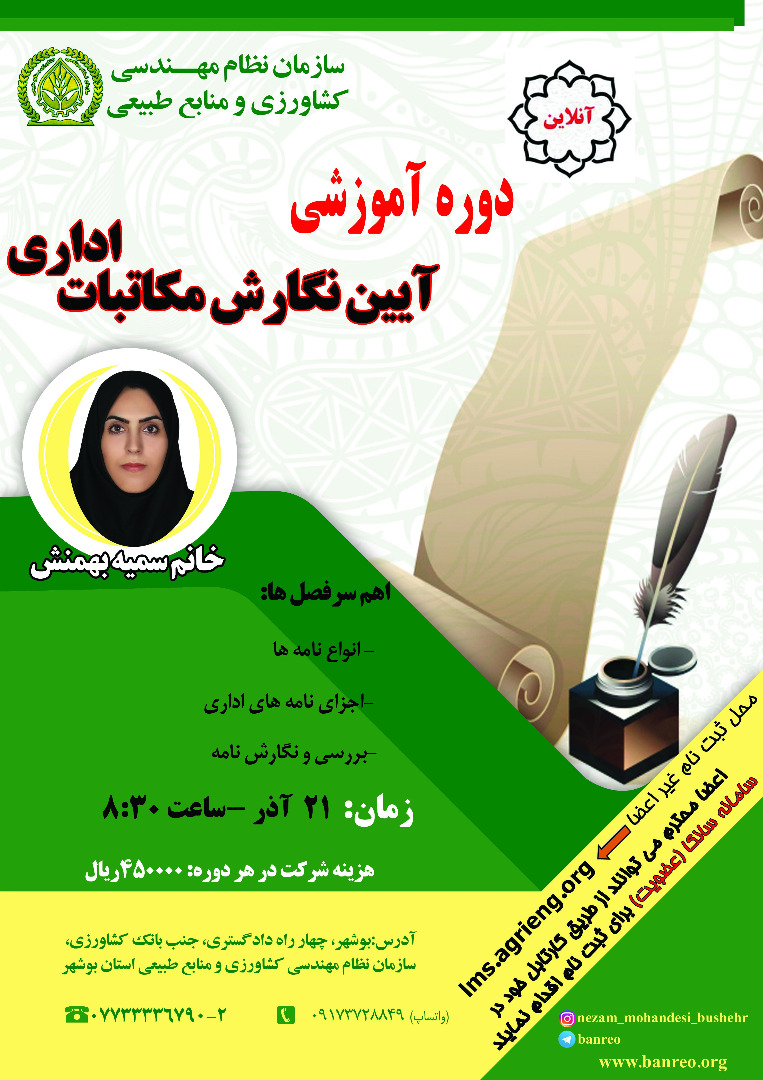✅دوره آموزشی آیین نگارش مکاتبات اداری توسط سازمان نظام مهندسی کشاورزی و منابع طبیعی استان بوشهر برگزار می گردد