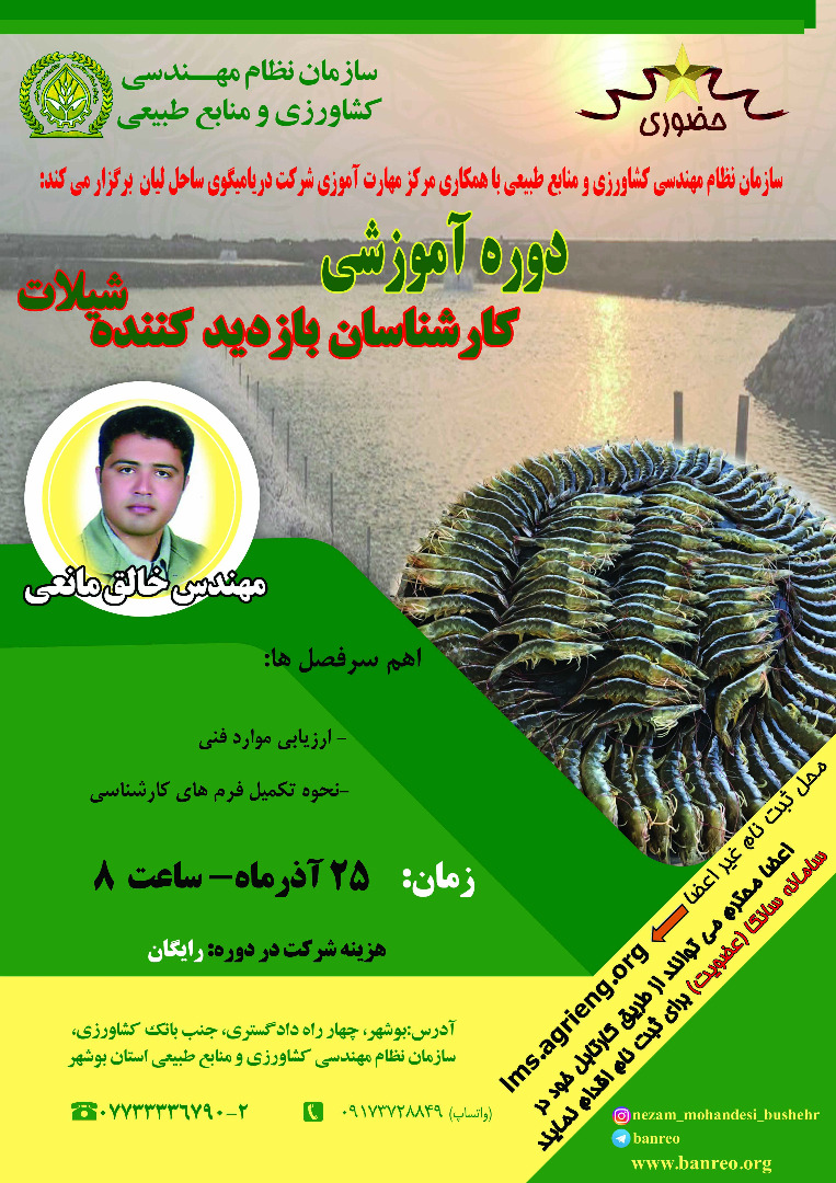 ✅ دوره آموزشی کارشناسان بازدید کننده شیلات توسط سازمان نظام مهندسی کشاورزی و منابع طبیعی استان بوشهر برگزار می گردد
