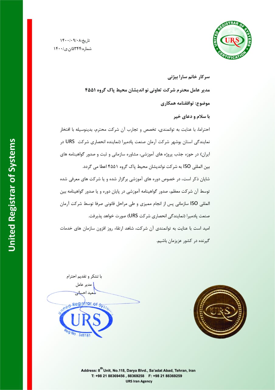 به گزارش روابط عمومی سنم استان نمایندگی شرکت(URS) United Registrar Systems در حوزه ی جذب پروژه های آموزشی، مشاوره سازمانی و ثبت و صدور گواهینامه های بین المللی ISO در استان بوشهر به شرکت فنی مهندسی نواندیشان محیط پاک اعطا شد.