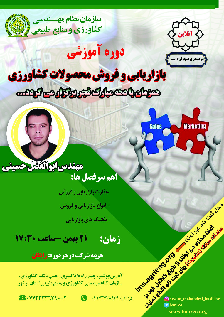 به گزارش روابط عمومی سنم استان به مناسبت آغاز دهه مبارک فجر دوره آموزشی بازاریابی و فروش محصولات کشاورزی توسط سازمان نظام مهندسی کشاورزی و منابع طبیعی استان بوشهر به صورت رایگان برگزار می گردد
