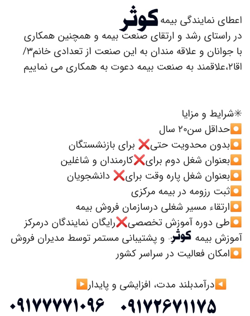 اعطای کد نمایندگی رسمی بیمه کوثر 5سال کارمزد(حقوق)برای هر بیمه شماره تماس 09177771096 واتس آپ 09172671175 از طریق واتساپ ارتباط حاصل فرمایید