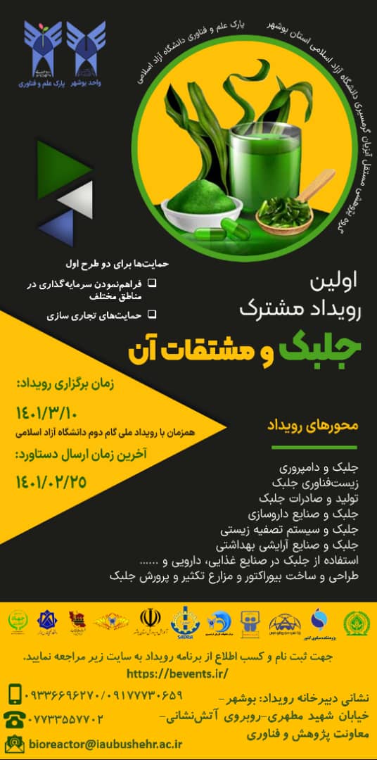 ✅به گزارش روابط عمومی سنم استان با همکاری سازمان نظام مهندسی کشاورزی و منابع طبیعی استان، پارک علم و فناوری و گروه پژوهشی مستقل آبزیان گرمسیری دانشگاه آزاد اسلامی، اولین رویداد مشترک جلبک و مشتقات آن برگزار می گردد.