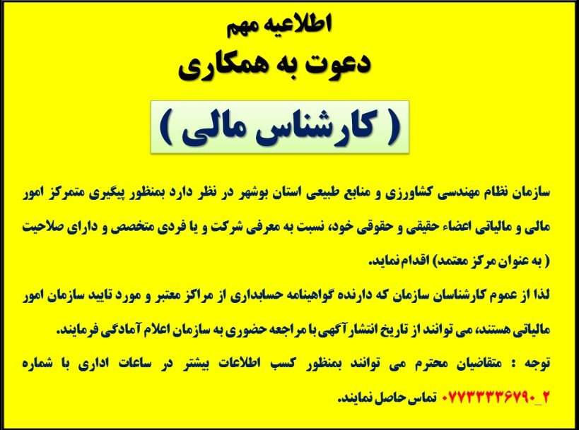سازمان نظام مهندسی کشاورزی و منابع طبیعی استان بوشهر در نظر دارد بمنظور پیگیری متمرکز امور مالی و مالیاتی اعضاء حقیقی و حقوقی خود، نسبت به معرفی شرکت و یا فردی متخصص و دارای صلاحیت ( به عنوان مرکز معتمد) اقدام نماید.