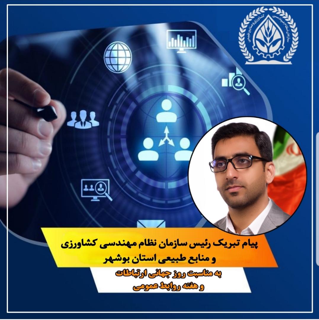 🔻به مناسبت روز جهانی ارتباطات و هفته روابط عمومی، دکتر ضرغام حیدریه رئیس سازمان نظام مهندسی کشاورزی و منابع طبیعی استان بوشهر با صدور پیام تبریکی این روز را به فعالان عرصه ارتباطات تبریک و تهنیت گفت.