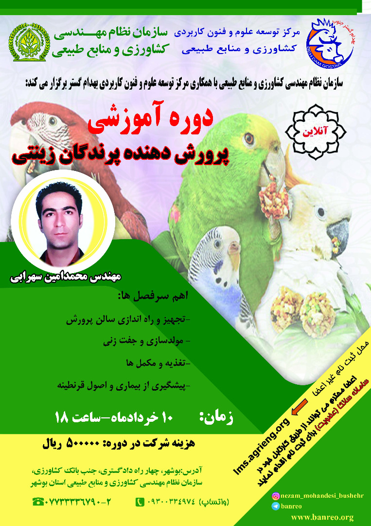 ❇️ به اطلاع علاقمندان دوره آموزشی پرورش پرندگان زینتی می رساند' سازمان نظام مهندسی کشاورزی و منابع طبیعی استان بوشهر در نظر دارد دوره آموزشی مذکور را برگزار نماید.
