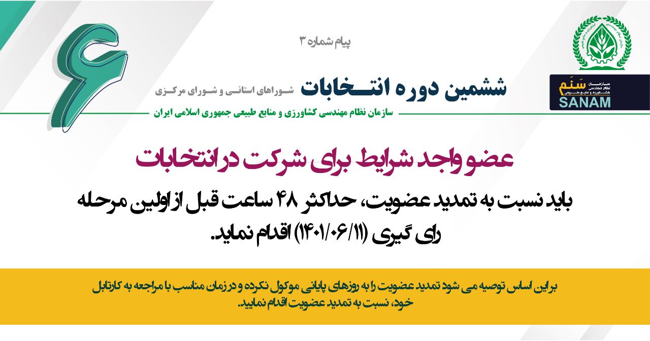 🔸برای شرکت در انتخابات، باید نسبت به تمدید عضویت حداکثر ۴۸ قبل از اولین مرحله رأی گیری (۱۴۰۱/۰۶/۱۱) اقدام نماید.
