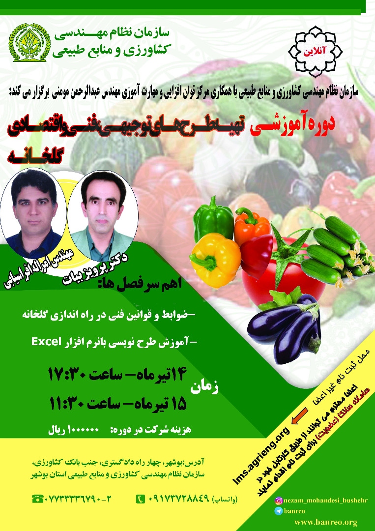 به گزارش روابط عمومی سنم استان دوره آموزشی تهیه طرح توجیهی فنی و اقتصادی گلخانه توسط سازمان نظام مهندسی کشاورزی و منابع طبیعی استان بوشهر برگزار می گردد.