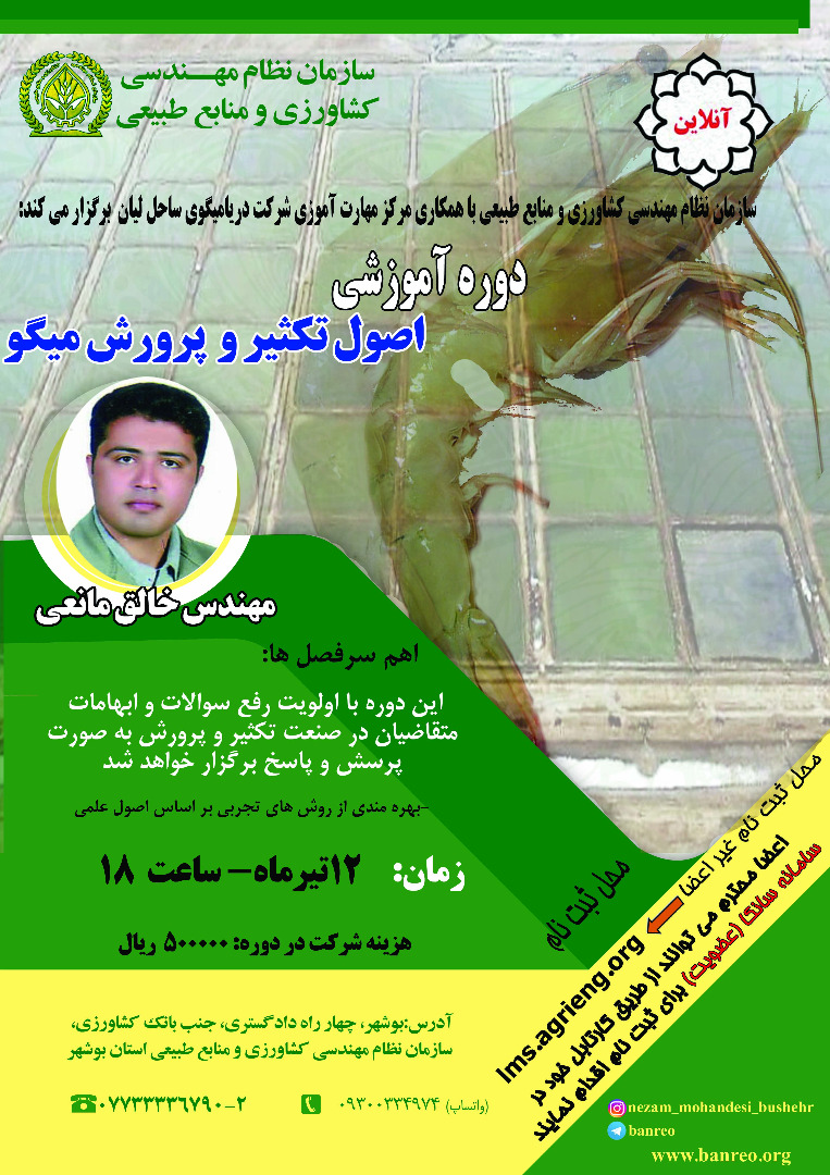 ⏪به گزارش روابط عمومی سنم استان دوره آموزشی اصول و پرورش تکثیر میگو توسط سازمان نظام مهندسی کشاورزی و منابع طبیعی استان بوشهر برگزار می گردد.