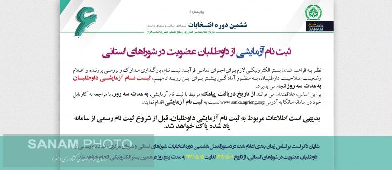 شایان ذکر است بر اساس زمان بندی اعلام شده در دستورالعمل ششمین دوره انتخابات شوراهای استانی و شورای مرکزی، ثبت نام رسمی از داوطلبان عضویت در شوراهای استانی، از تاریخ 01/05/1401 لغایت 05/05/1401 به مدت پنج روز در همین بستر الکترونیکی انجام خواهد شد