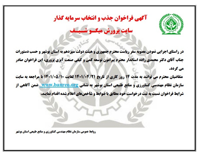 متقاضیان محترم می توانند جهت ثبت نام در فراخوان مذکور از تاریخ ۲۱ تیرماه تا ۱۰ مرداد ماه سال جاری به پایگاه اطلاع رسانی سازمان نظام مهندسی کشاورزی و منابع طبیعی استان بوشهر به نشانی www.banreo.org مراجعه فرمایند.