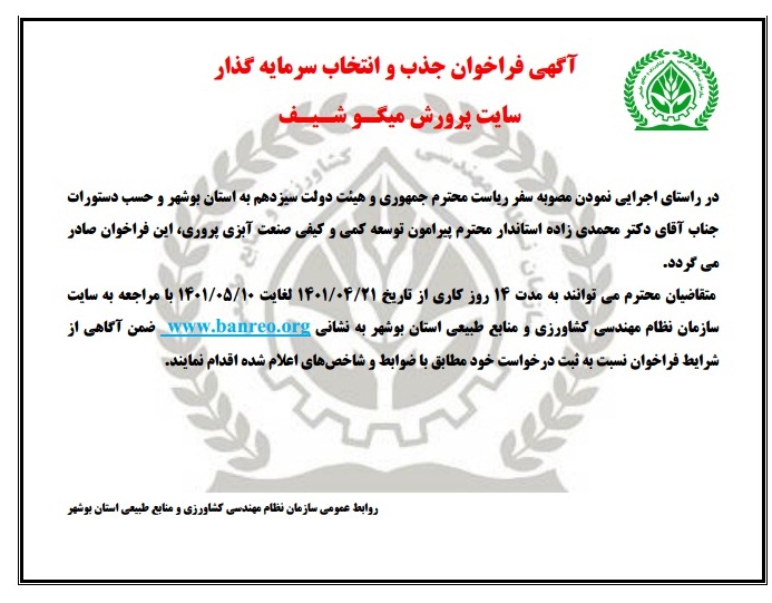 لینک مستقیم فراخوان جذب و انتخاب سرمایه گذار سایت پرورش میگو شیف http://banreo.org/SabtSarmayeGozarBushehr