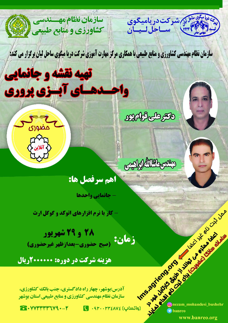 ❇️ به اطلاع علاقمندان و کارشناسان آبزی پروری می رساند "سازمان نظام مهندسی کشاورزی و منابع طبیعی استان بوشهر با همکاری شرکت دریا میگوی ساحل لیان" در نظر دارد دوره آموزشی تهیه نقشه و جانمایی واحدهای آبزی پروری را برگزار نماید.