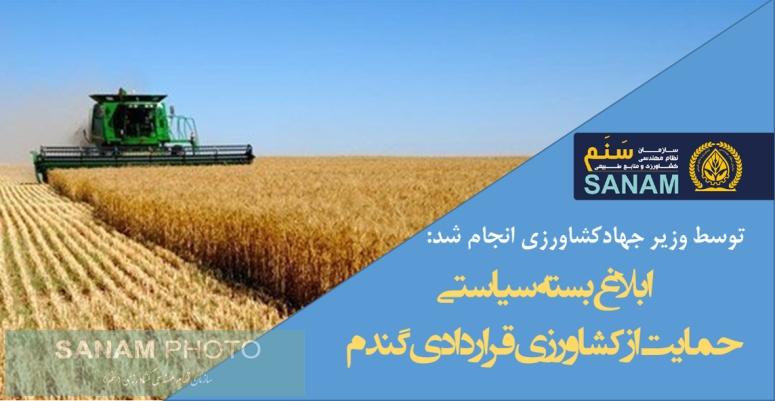 به گزارش پایگاه اطلاع رسانی سنم به نقل از وزارت جهادکشاورزی، سید جواد ساداتی نژاد وزیر جهاد کشاورزی و رئیس شورای قیمت گذاری و اتخاذ سیاستهای حمایتی محصولات اساسی کشاورزی، در نامهای به وزارتخانه های جهاد کشاورزی، امور اقتصادی و دارایی، صنعت، معدن و تجارت، سازمان برنامه و بودجه کشور، بانک مرکزی جمهوری اسلامی ایران و بانک کشاورزی، مصوبه این شورا در زمینه "بسته سیاستی حمایت از کشاورزی قراردادی گندم" را ابلاغ کرد.