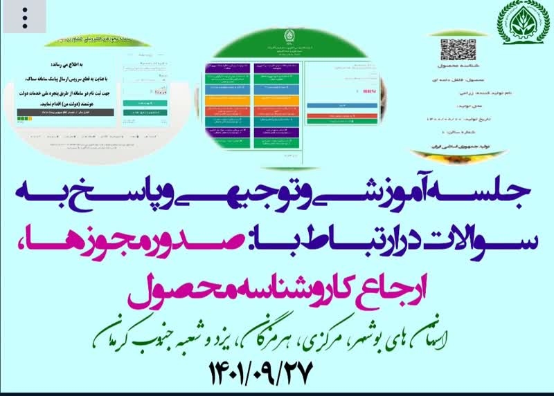 جلسه آموزشی و توجیهی و پاسخ به سوالات در ارتباط با صدور مجوزها، ارجاع کار و شناسه محصول با حضور کارشناسان استان و ستاد مرکزی بصورت برخط برگزار گردید.