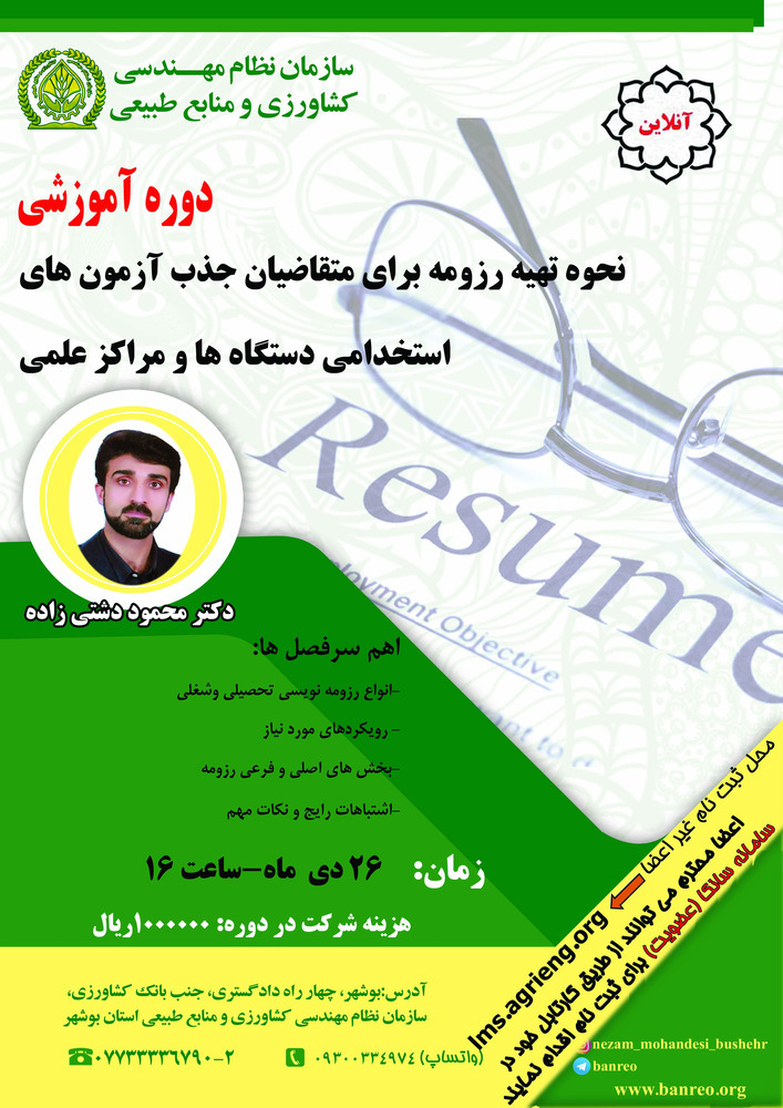 به گزارش روابط عمومی سنم استان دوره آموشی تهیه رزومه برای متقاضیان جذب آزمون های استخدامی دستگاه ها و مراکز علمی توسط سازمان نظام مهندسی کشاورزی و منابع طبیعی استان بوشهر برگزار می گردد.