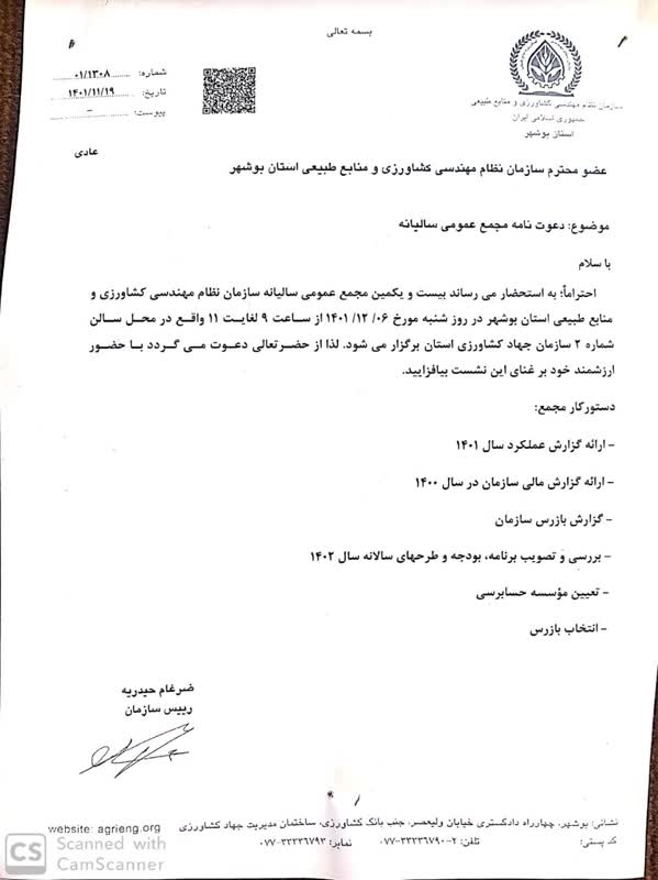 دعوت نامه مجمع عمومی سالیانه سازمان نظام مهندسی کشاورزی و منابع طبیعی استان بوشهر