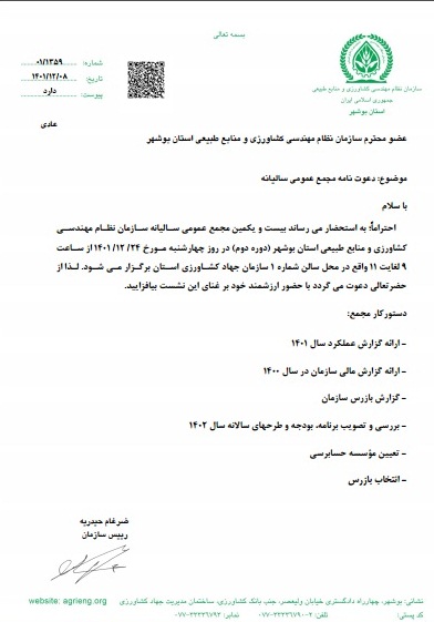 دعوتنامه مجمع عمومی سالیانه سازمان نظام مهندسی کشاورزی و منابع طبیعی استان بوشهر