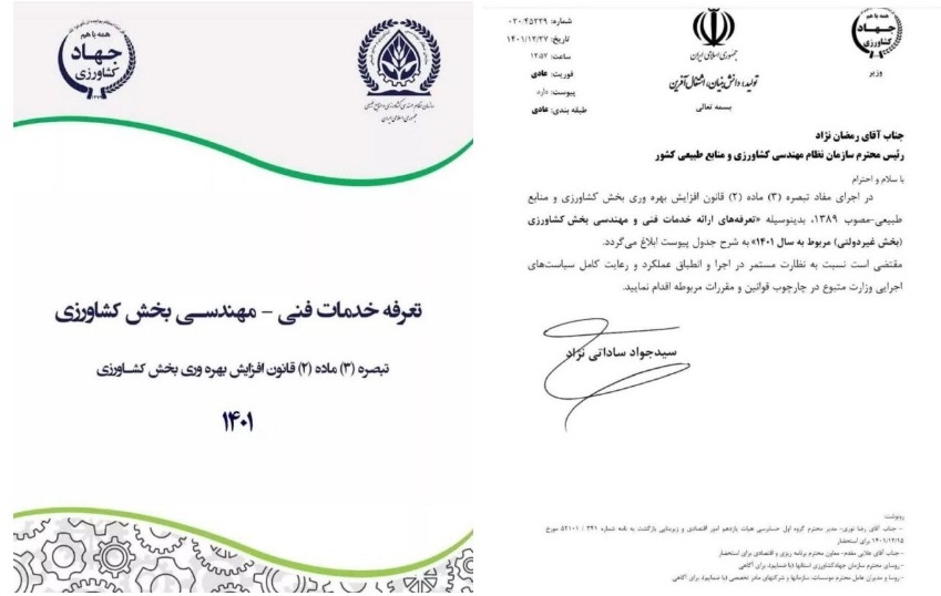 تعرفههای ارایه خدمات فنی و مهندسی و صدور مجوز و پروانه واحدهای تولیدی بخش کشاورزی در سال ۱۴۰۱ در بخش غیردولتی توسط وزیر جهادکشاورزی به سازمان جهاد کشاورزی استانها، سازمان نظام مهندسی کشاورزی و منابع طبیعی و سازمانها و موسسات و شرکتهای مادر تخصصی بخش کشاورزی برای اجرا ابلاغ شد.