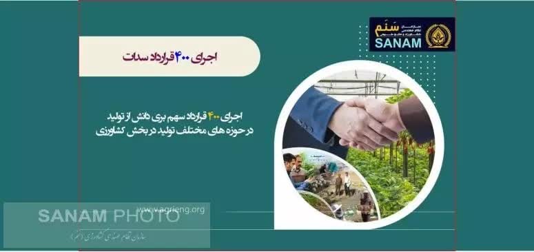 تاکنون بیش از ۴۰۰ قرارداد سهم بری دانش از تولید در حوزه های مختلف تولید در بخش کشاورزی با مشارکت کارشناسان و بهره برداران اجرا شده است.
