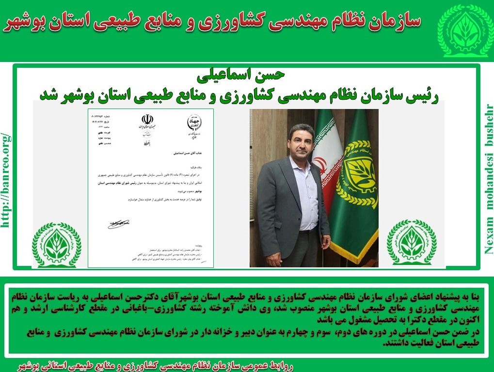 محمد علی نیکبخت وزیر جهاد کشاورزی در اجرای تبصره 3 ماده 7 قانون تاسیس سازمان نظام مهندسی کشاورزی و منابع طبیعی حسن اسماعیلی را به عنوان رئیس سازمان نظام مهندسی استان بوشهر منصوب کرد.