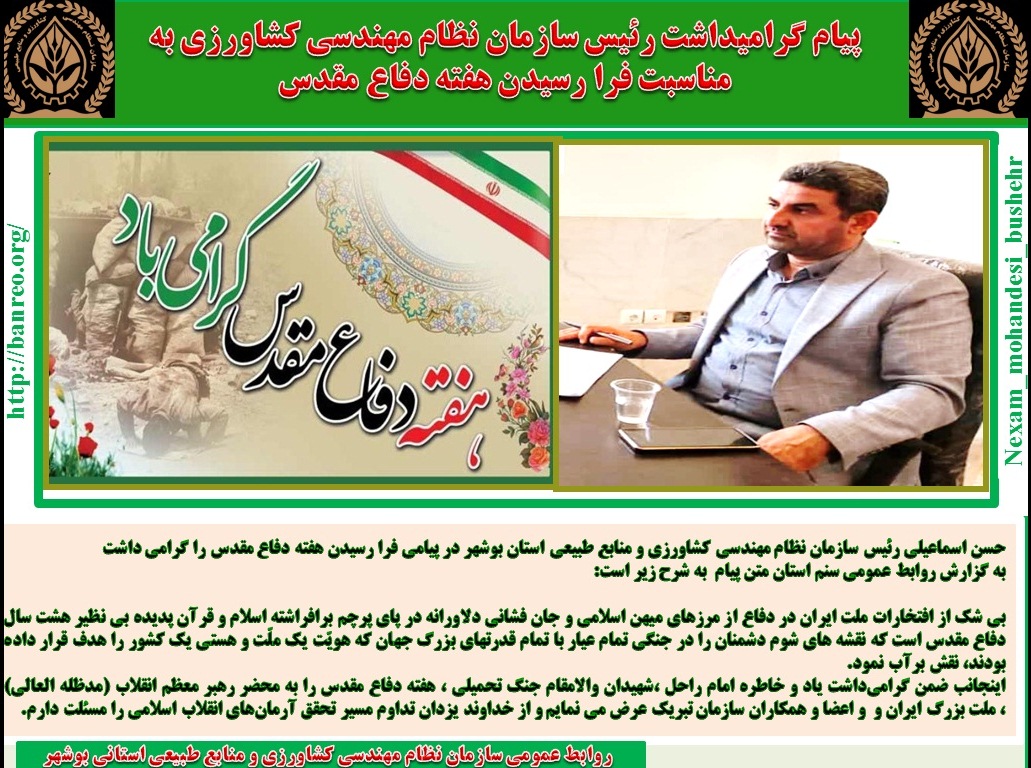 حسن اسماعیلی رئیس سازمان نظام مهندسی کشاورزی و منابع طبیعی استان بوشهر در پیامی فرا رسیدن هفته دفاع مقدس را گرامی داشت