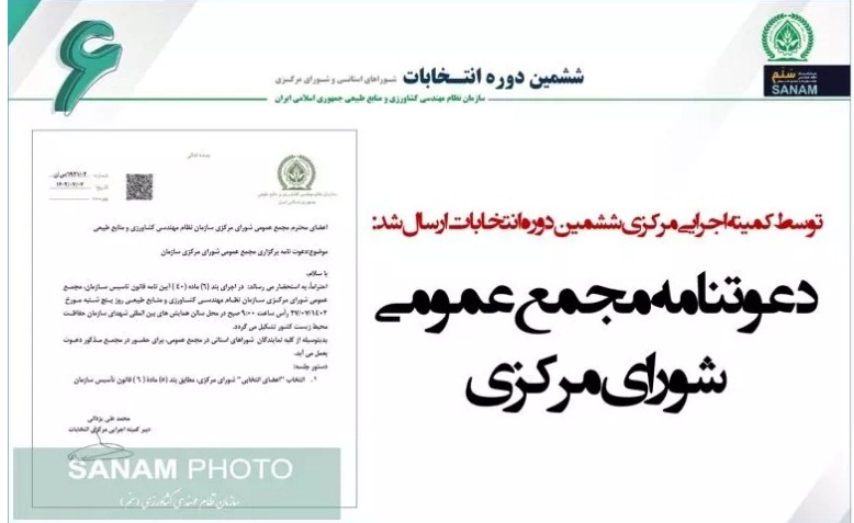 در اجراي بند (6) ماده (40) آيين نامه اجرایی قانون تاسيس، دعوتنامه مجمع عمومي شوراي مركزي سازمان نظام مهندسي كشاورزي و منابع طبيعي به اعضای مجمع عمومی ارسال گردید.