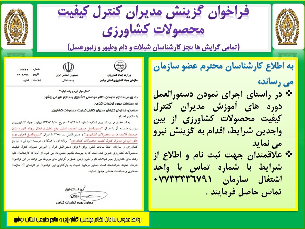 vدر راستای اجرای نمودن دستورالعمل دوره های آموزش مدیران کنترل کیفیت محصولات کشاورزی از بین واجدین شرایط، اقدام به گزینش نیرو می نماید