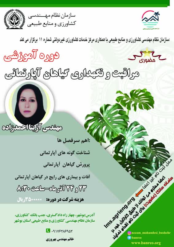 سازمان نظام مهندسی کشاورزی و منابع طبیعی استان بوشهر با همکاری مرکز خدمات کشاورزی غیردولتی شماره 11 دوره آموزشی مراقبت و نگهداری گیاهان آپارتمانی را برگزار می کند.