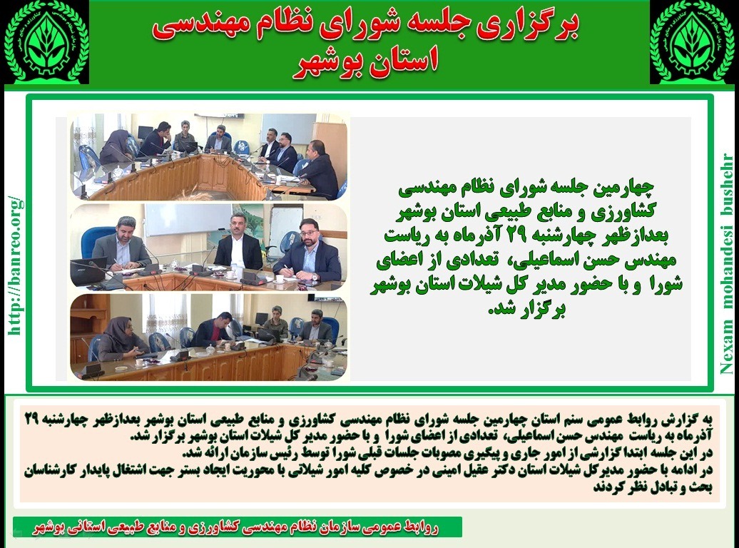 به گزارش روابط عمومی سنم استان چهارمین جلسه شورای نظام مهندسی کشاورزی و منابع طبیعی استان بوشهر بعدازظهر چهارشنبه 29 آذرماه با حضور مهندس حسن اسماعیلی رئیس سازمان و تعدادی از اعضای شورا برگزار شد.