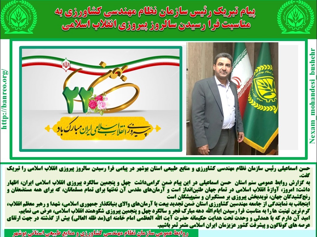 به گزارش روابط عمومی سنم استان حسن اسماعیلی در این پیام ضمن گراميداشت چهل و پنجمین سالگرد پيروزي انقلاب اسلامي ايران، اظهار داشت: امروز، آوازۀ انقلاب اسلامي در تمام جهان طنينانداز است و آرمانهاي مقدس آن نهتنها براي تمام مسلمانان، كه براي همه مستضعفان و رنجكشيدگان جهان، نويدبخش پيروزي بر مستكبران و ستمپيشگان است اینجانب به نمایندگی از جامعه مهندسین کشاورزی استان ضمن تجدید بیعت با آرمانهای والای بنیانگذار جمهوری اسلامی، شهدا و رهبر معظم انقلاب، گرم ترین تهنیت ها را به مناسبت فرا رسیدن ایام الله دهه مبارک فجر و سالگرد چهل و پنجمین پیروزی شکوهمند انقلاب اسلامی، عرض می نمایم. امید آن دارم که با همدلی و وحدت تحت هدایت حکیمانه حضرت آیت الله العظمی امام خامنه ای(مد ظله العالی) بیش از گذشته در جهت ارتقای عرصه های گوناگون و پیشرفت کشور عزیزمان ایران اسلامی مثمر ثمر باشیم.
