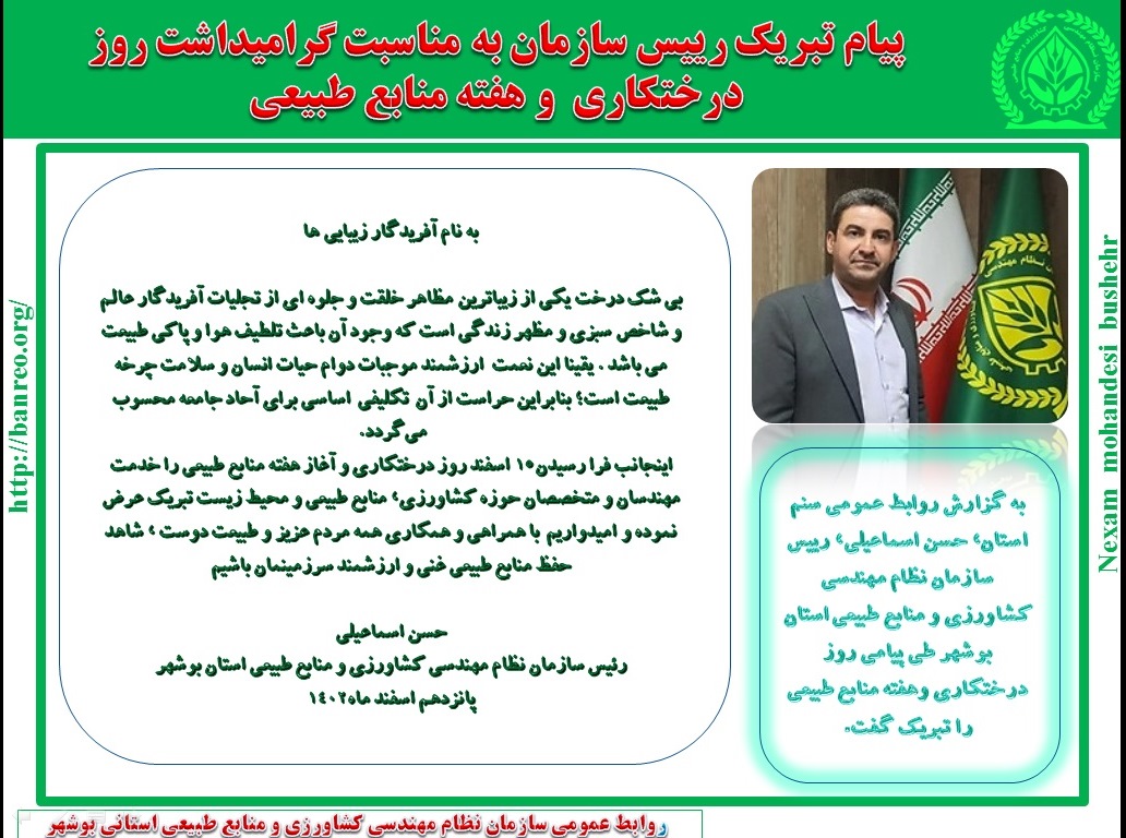 به گزارش روابط عمومی سنم استان، حسن اسماعیلی؛ رییس سازمان نظام مهندسی کشاورزی و منابع طبیعی استان بوشهر در پیامی روز درختکاری وهفته منابع طبیعی را تبریک گفت.