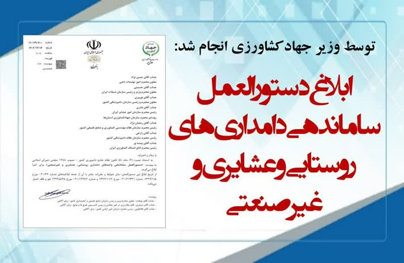 دستورالعمل ساماندهي دامداري هاي روستايي و عشايري و غيرصنعتي توسط وزیر جهادکشاورزی برای اجرا به سازمان های و مراکز تابعه مربوطه ابلاغ شد.