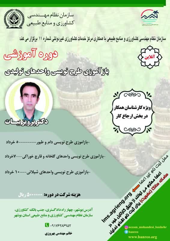 سازمان نظام مهندسی کشاورزی و منابع طبیعی استان بوشهر با همکاری مرکز خدمات کشاورزی غیردولتی شماره 11 *دوره آموزشی بازآموزی طرح نویسی واحدهای تولیدی* را ویژه کارشناسان همکار در بخش ارجاع کار به صورت "آنلاین" برگزار می کند.