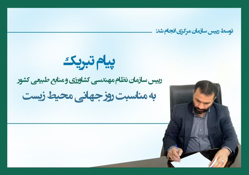 رییس سازمان نظام مهندسی کشاورزی و منابع طبیعی کشور به مناسبت روز جهانی محیط زیست، با صدور پیامی این روز را به رییس سازمان حفاظت محیط زیست و تمامی فعالان عرصه محیط زیست کشور تبریک گفت