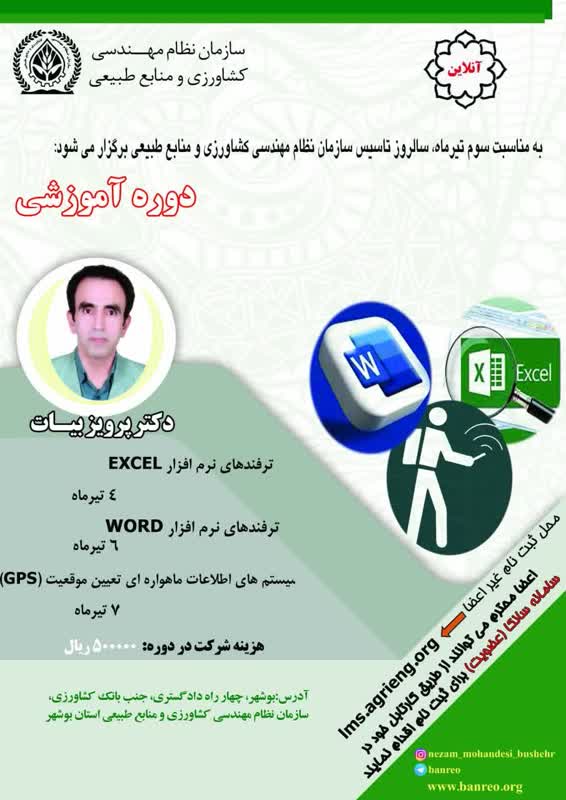 سازمان نظام مهندسی کشاورزی و منابع طبیعی استان بوشهر به مناسبت سوم تیر ماه سالروز تاسیس سازمان دوره های آموزشی ذیل به صورت "آنلاین" برگزار می کند.