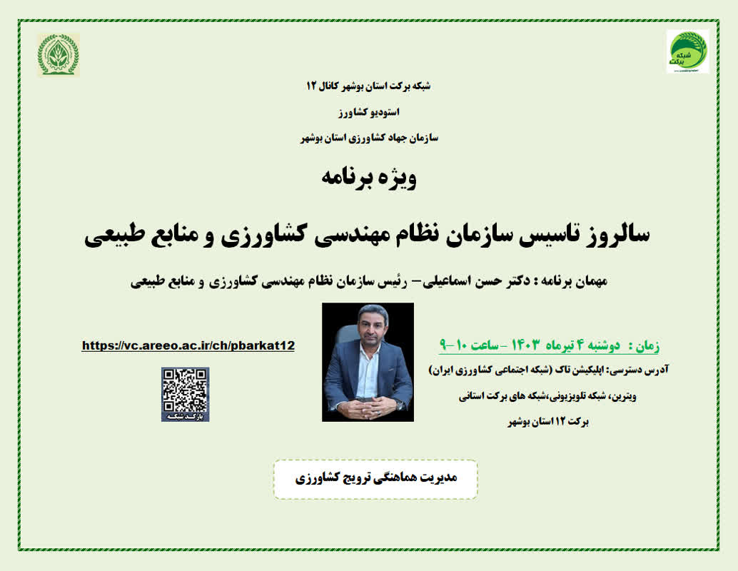 به گزارش روابط عمومی سنم استان به مناسبت سالروز تاسیس سازمان نظام مهندسی کشاورزی و منابع طبیعی ویژه برنامه ای در بستر شبکه برکت کانال ۱۲ برگزار می گردد