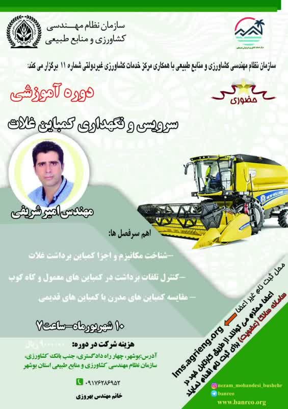 سازمان نظام مهندسی کشاورزی و منابع طبیعی استان بوشهر با همکاری مرکز خدمات کشاورزی غیردولتی شماره 11 *دوره آموزشی سرویس و نگهداری کمباین غلات* برگزار می کند.