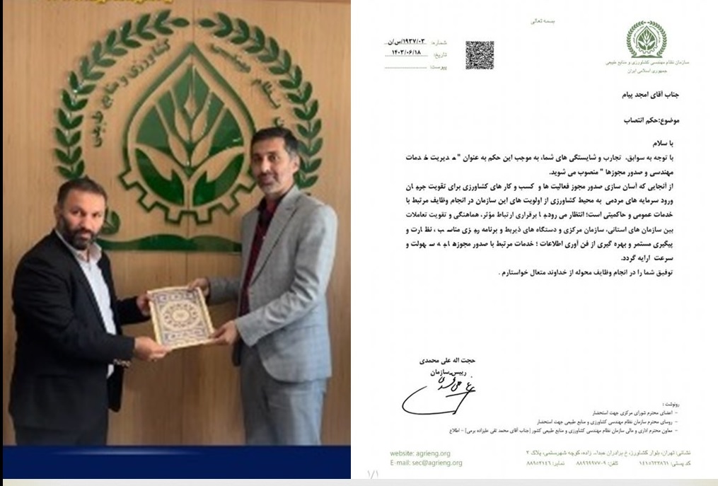 در حکمی از سوی "حجت اله علی محمدی" رئیس سازمان نظام مهندسی کشاورزی و منابع طبیعی کشور، "امجد پیام" به عنوان "مدیریت خدمات مهندسی و صدور مجوزها" منصوب شد.