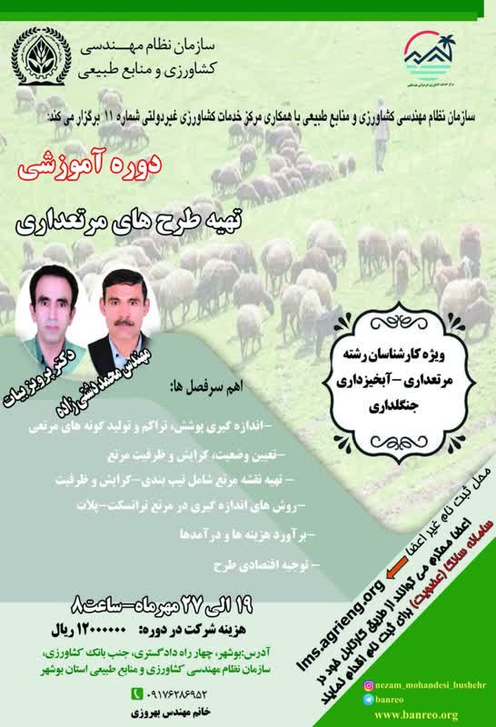 سازمان نظام مهندسی کشاورزی و منابع طبیعی استان بوشهر با همکاری مرکز خدمات کشاورزی غیردولتی شماره 11 *دوره آموزشی تهیه طرح های مرتعداری* برگزار می کند.