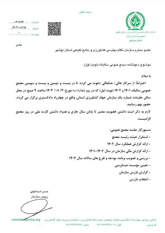 آگهی دعوت به مجمع عمومی عادی نوبت اول سازمان نظام مهندسی کشاورزی و منابع طبیعی استان بوشهر با سلام و احترام