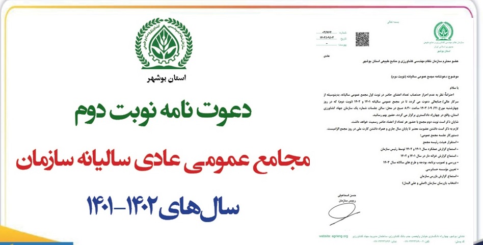 نظر به عدم احراز حد نصاب تعداد اعضای حاضر در نوبت اول مجمع عمومی سال ۱۴۰۲؛ نوبت دوم مجامع عمومی عادی سالیانه سالهای۱۴۰۱ و ۱۴۰۲ سازمان روز چهارشنبه مورخ 21 آذر ماه ۱۴۰۳ از ساعت ۸:۳۰ در محل سالن شماره یک سازمان جهاد کشاورزی استان واقع در بوشهر- چهارراه دادگستری برگزار خواهد شد.