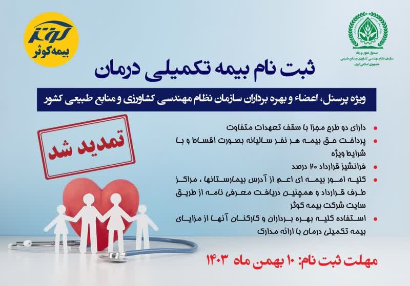 ثبت نام بیمه تکمیلی درمان ۱۴۰۳ *تا ۱۰ بهمن ماه تمدید شد* ویژه پرسنل اعضاء و بهره برداران سازمان نظام مهندسی کشاورزی و منابع طبیعی کشور دارای دو طرح مجزا با سقف تعهدات متفاوت پرداخت حق بیمه هر نفر سالیانه بصورت اقساط و با شرایط ویژه فرانشیز قرارداد ۲۰ درصد کلیه امور بیمه ای اعم از آدرس بیمارستان ها، مراکز طرف قرارداد و همچنین دریافت معرفی نامه از طریق سایت شرکت بیمه کوثر استفاده کلیه بهره برداران و کارکنان آنها از مزایای بیمه تکمیلی درمان با ارائه مدارک